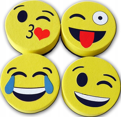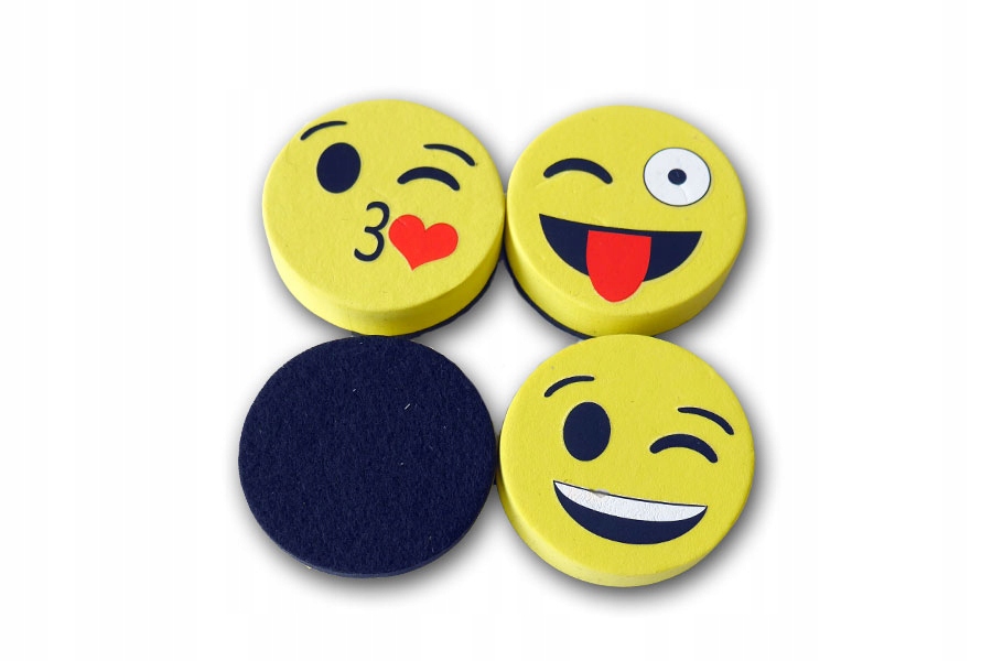 Gąbki do tablic sucho ścieralnych to nieodłączny element każdej tablicy. Gąbka posiada wbudowany magnes, dzięki któremu gąbeczkę można przymocować do tablicy lub lodówki. Komplet składa się z 4 sztuk wesołych, odlotowych buziek. Mają wbudowany magnes, dzięki któremu gąbeczki mogą być przymocowane do tablicy magnetycznej. Średnica buźki to 5 cm.