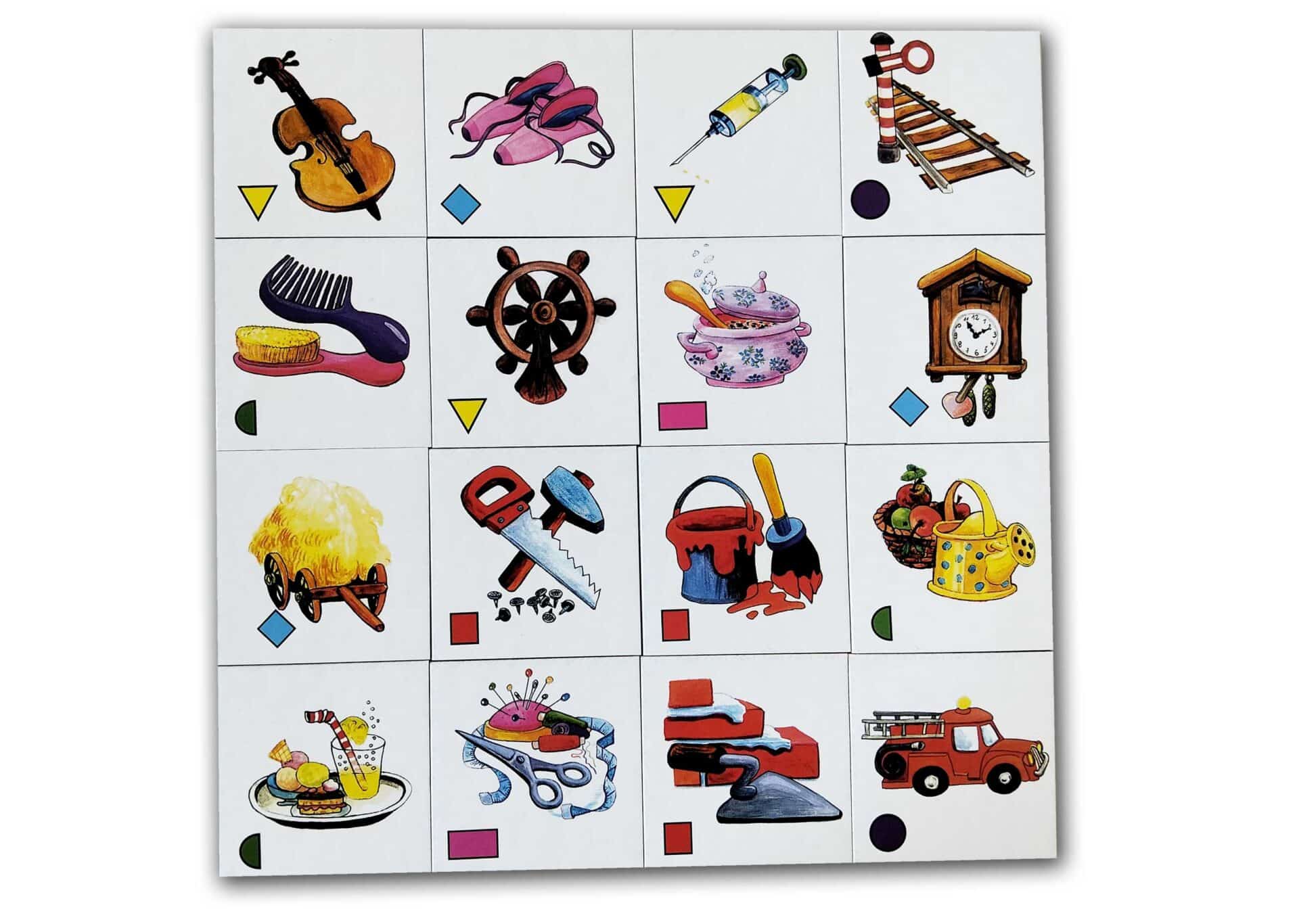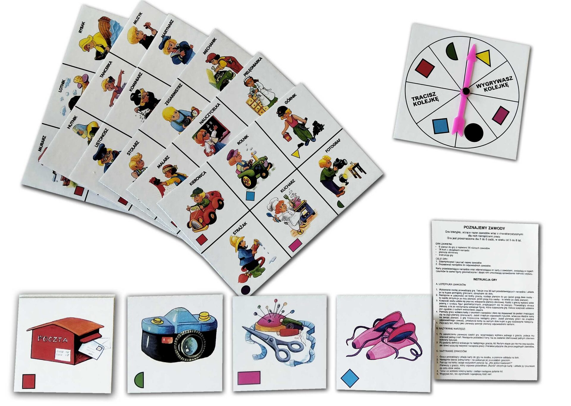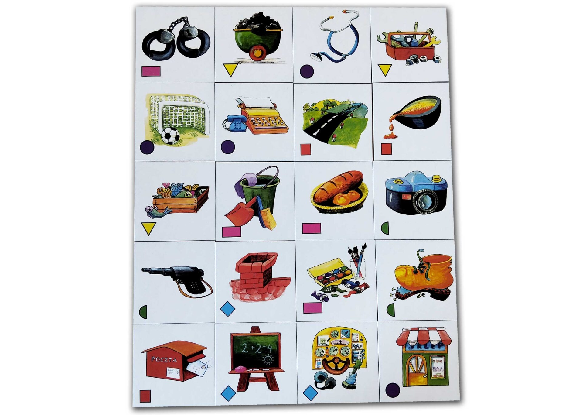 Karty przedstawiające narzędzia oraz odpowiadające im karty z zawodami, posiadają w rogach rysunków te same figury geometryczne i dzięki nim umożliwiają sprawdzenie trafności wyboru.