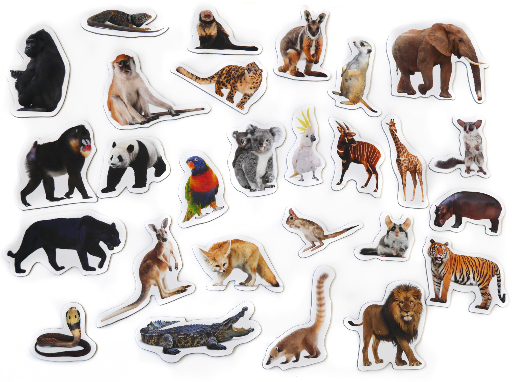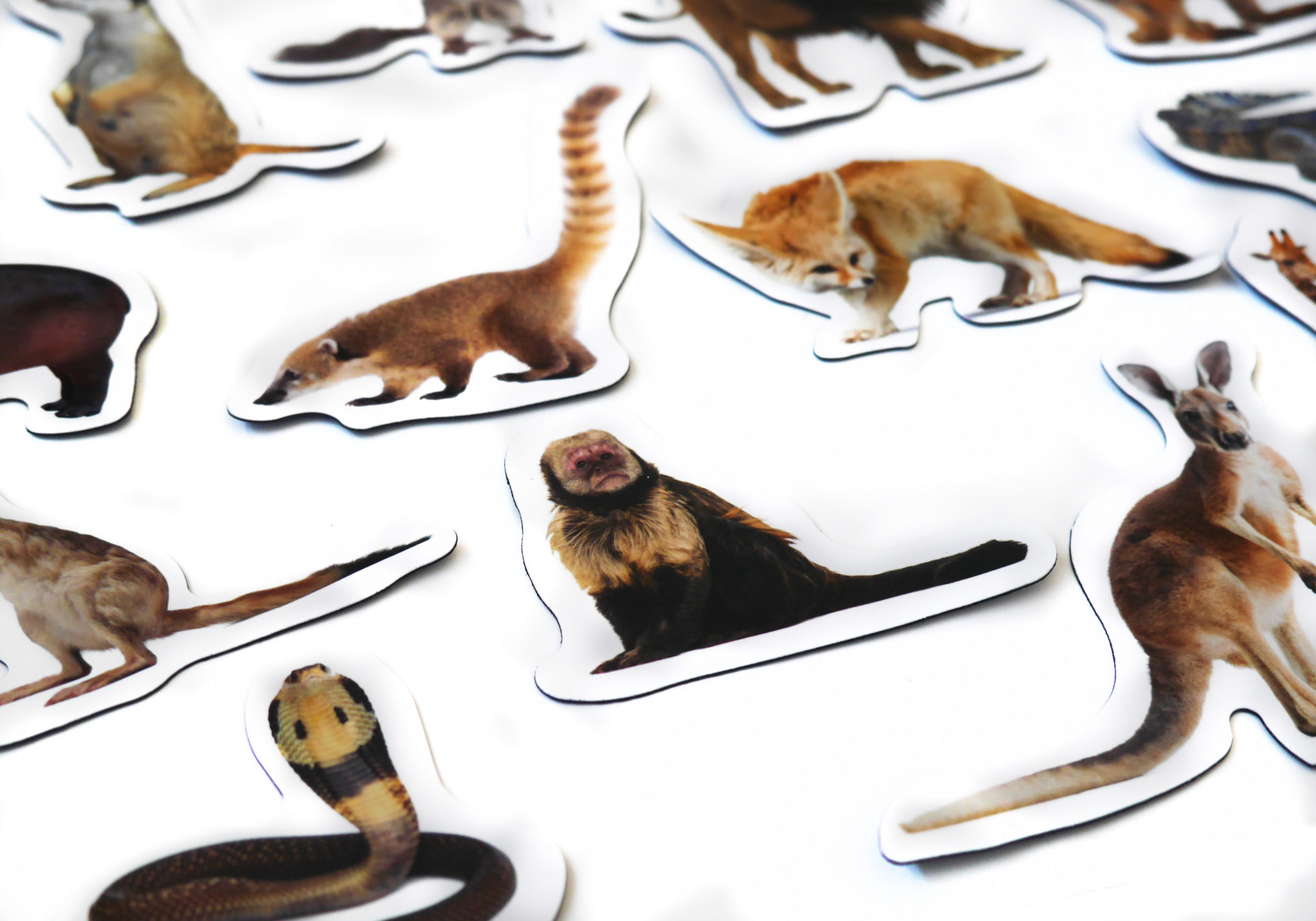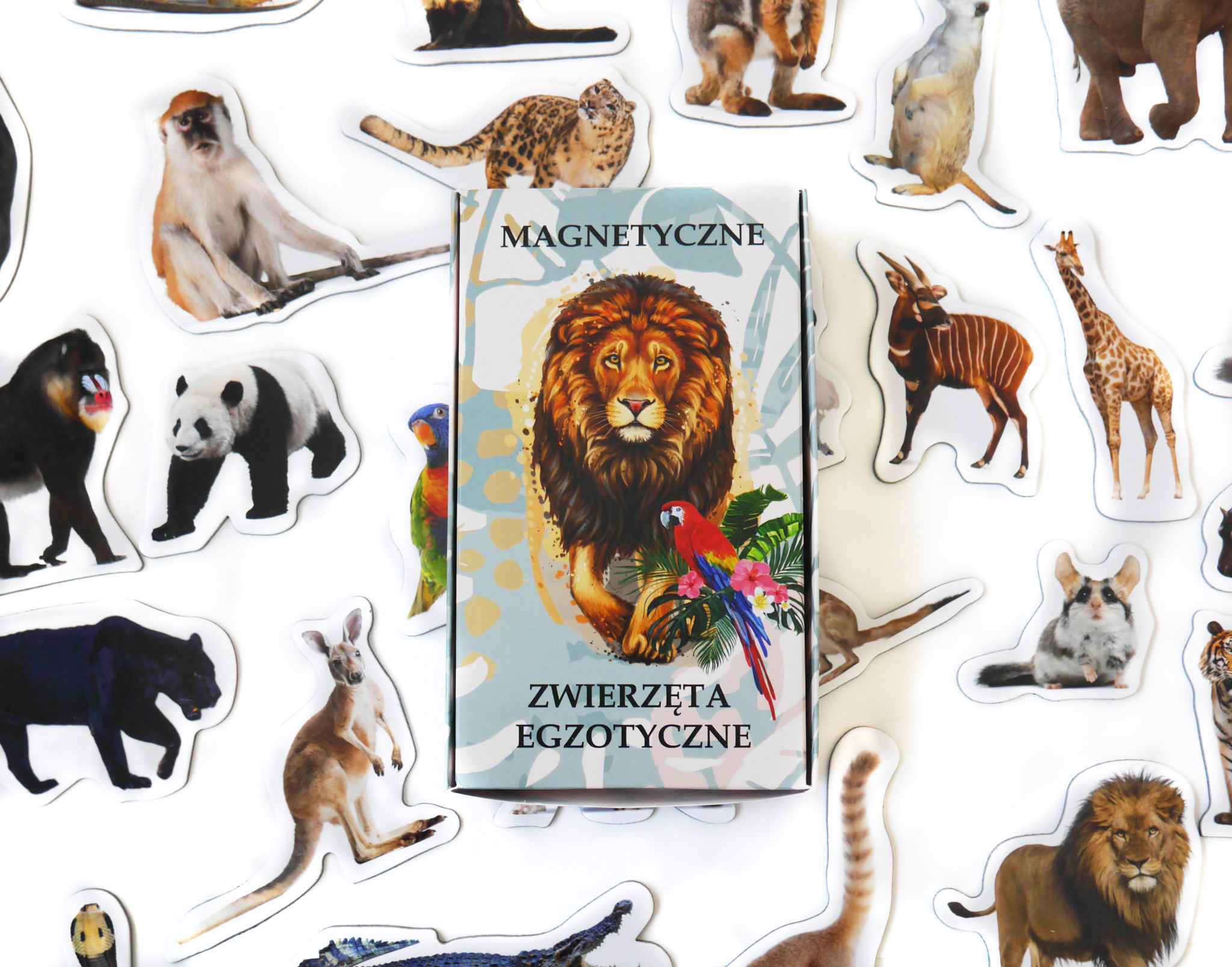 Magnesy na lodówkę ZWIERZĘTA EGZOTYCZNE, to komplet 28 sztuk, wyciętych po konturze, zwierzątek przy użyciu robionych na zamówienie wykrojników. Magnesy uczą, dziecko rozpoznawać zwierzęta drapieżne. Magnesy wykonane są w wersji soft ( miękkie i elastyczne) składają się z papieru i folii magnetycznej  zapakowane w kartonik, idealne na prezent.